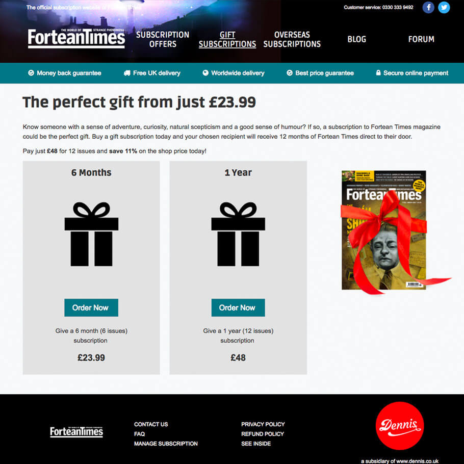 When I worked for Dennis Publishing, I was proud to be a part of the marathon two days where we tore every one of their publication's subscription sites from the ground and rebuilt them in a much more unified fashion. Fortean Times was my baby.